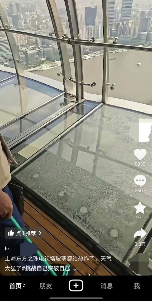 6 月 26 日凌晨,有网民在社交平台发布视频称,"上海东方明珠电视塔玻璃都给热炸了,天气太猛了"。视频中,一块地面透明玻璃出现细密的裂纹,远处是城市高楼大厦的街景。拍摄者指着出现裂纹的玻璃说:"刚才我的脚在这通联随配,就在这,然后这个炸了,那个炸的声音吓死我了。"
