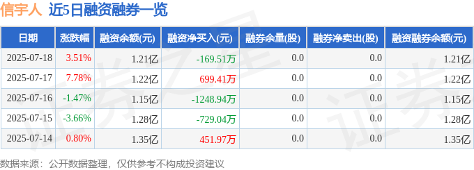 信宇人融资融券信息显示,融资方面,当日融资买入3423.75万元,融资偿还3593.27万元,融资净偿还169.51万元。融券方面,融券卖出0.0股,融券偿还0.0股,融券余量0.0股融可赢,融券余额0.0万元。融资融券余额1.21亿元。
