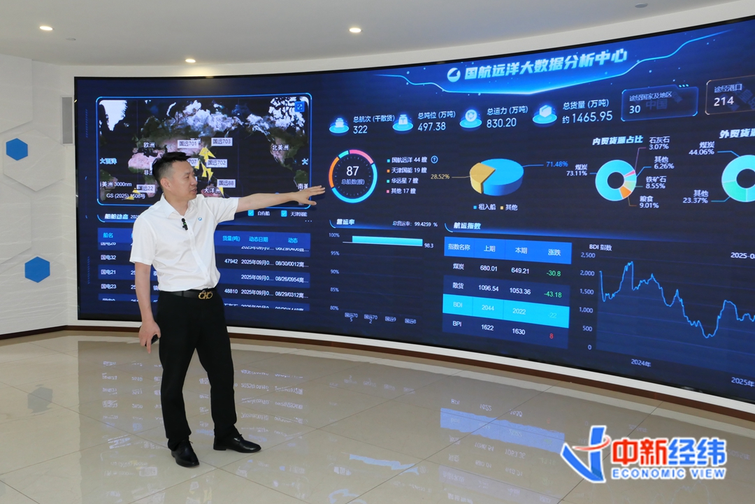 “在这个实时大屏能看到,今年总运货量达到了1465万吨,过往到达过的港口已经有214个,涉及30个国家和地区。”在国航远洋大数据分析中心的屏幕前,何志强向中新经纬介绍,通过实时数据,可以看到公司所有船只的具体位置、船舶动态,包括每一艘船上的集控室、甲板、驾驶室等情况,都可以清楚了解。